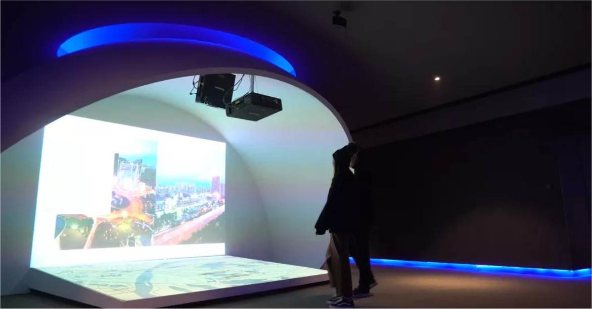 半球顶造型的L幕投影,以地幕+直幕联动的载体形式展示内容,以超强临在感带给观者影院级沉浸体验,非常适合阐释新世界T1所在区位的宏大背景。