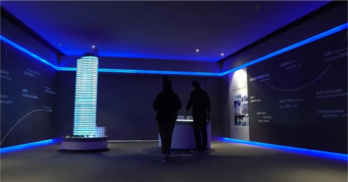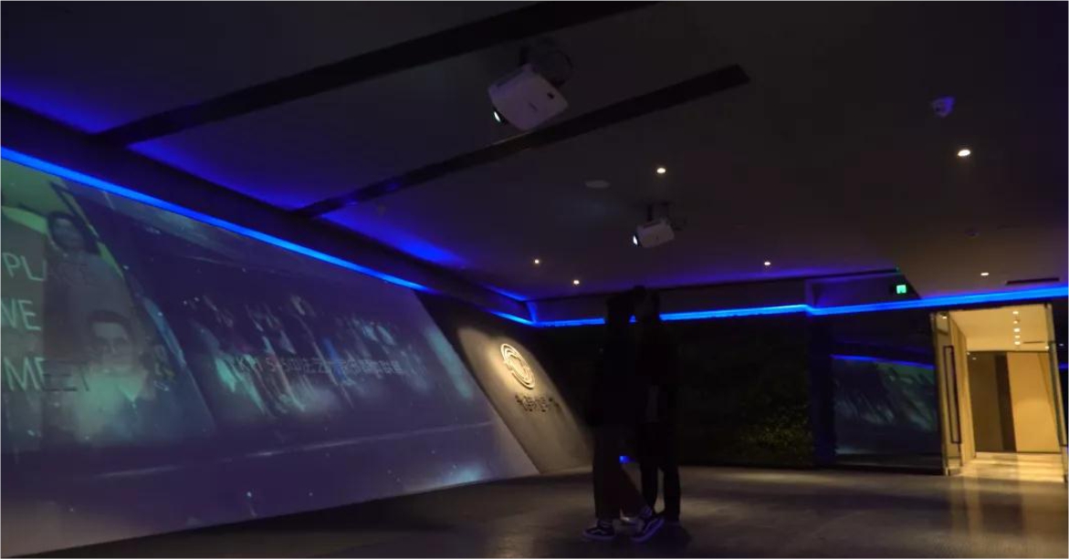 展厅入口采用倾斜墙面投影展示新世界品牌信息,利用现有空间的物理属性,低成本打造视觉的自然延展;应用于整个展厅的科技蓝光带,使整个观展区域色调统一,且空间层次明显。